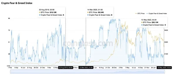 UST的恶性影响当然会引起监管部门的注意。上周美国财政部长耶伦在已经国会呼吁对稳定币采取监管。可预期的是,针对稳定币的制裁可能会迅速到来,而且会比以前更具惩罚性,市场情绪也因此陷入低迷。加密市场恐惧贪婪指数(CFGI)已跌至近两年的低点,甚至接近于2019年疫情爆发前的数值。