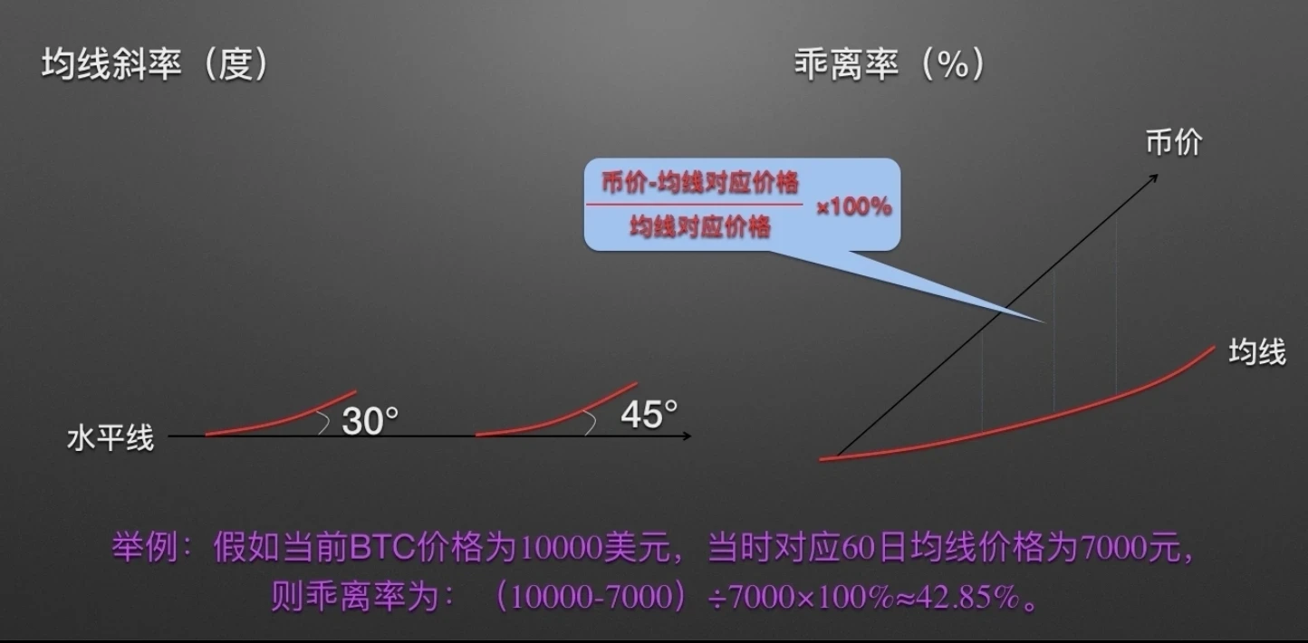 某一均线与水平线之间所形成夹角的度数称为该均线斜率,通常30度到45度区间时趋势的延续性比较好。币价与某一均线对应价格的差值除以均线对应价格,所得出的数值乘以100%为该均线所对应周期的乖离率。