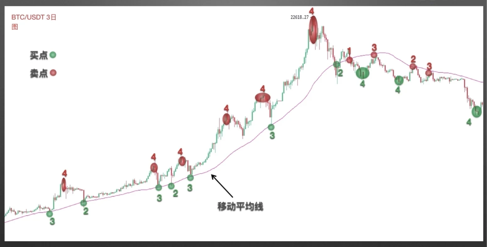 案例二截图来自欧易,BTC/USDT 3日图,图中均线参数为180。在2015年开始的那一轮大牛市中,该均线起到了非常重要的支撑作用。在上涨途中,均线多次在回落低位给出2、3类买点提示。在2018年后多次反弹高位给出卖出提示。