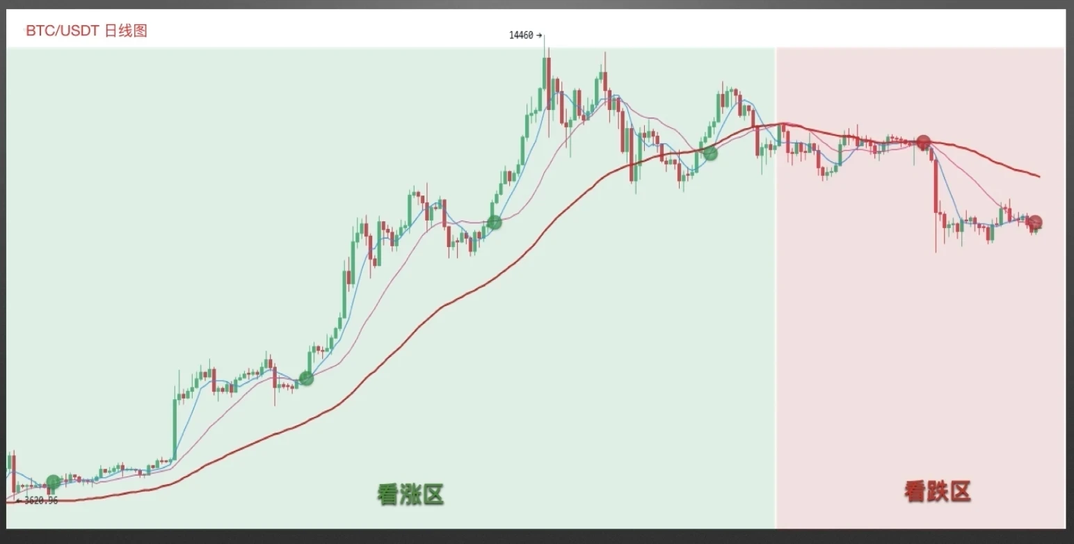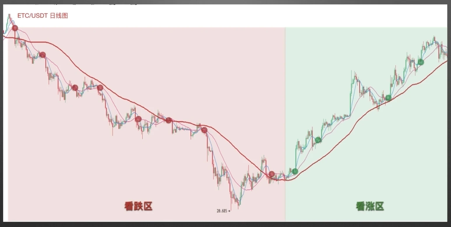 案例二截图来自欧易,ETC/USDT日线图,在看跌区,短期均线下穿中期均线几乎都发生在一段大跌行情初期,据此操作,无疑帮我们规避了很多风险。在看涨区形成后,三均线组合又帮我们抓住了很多买入机会。