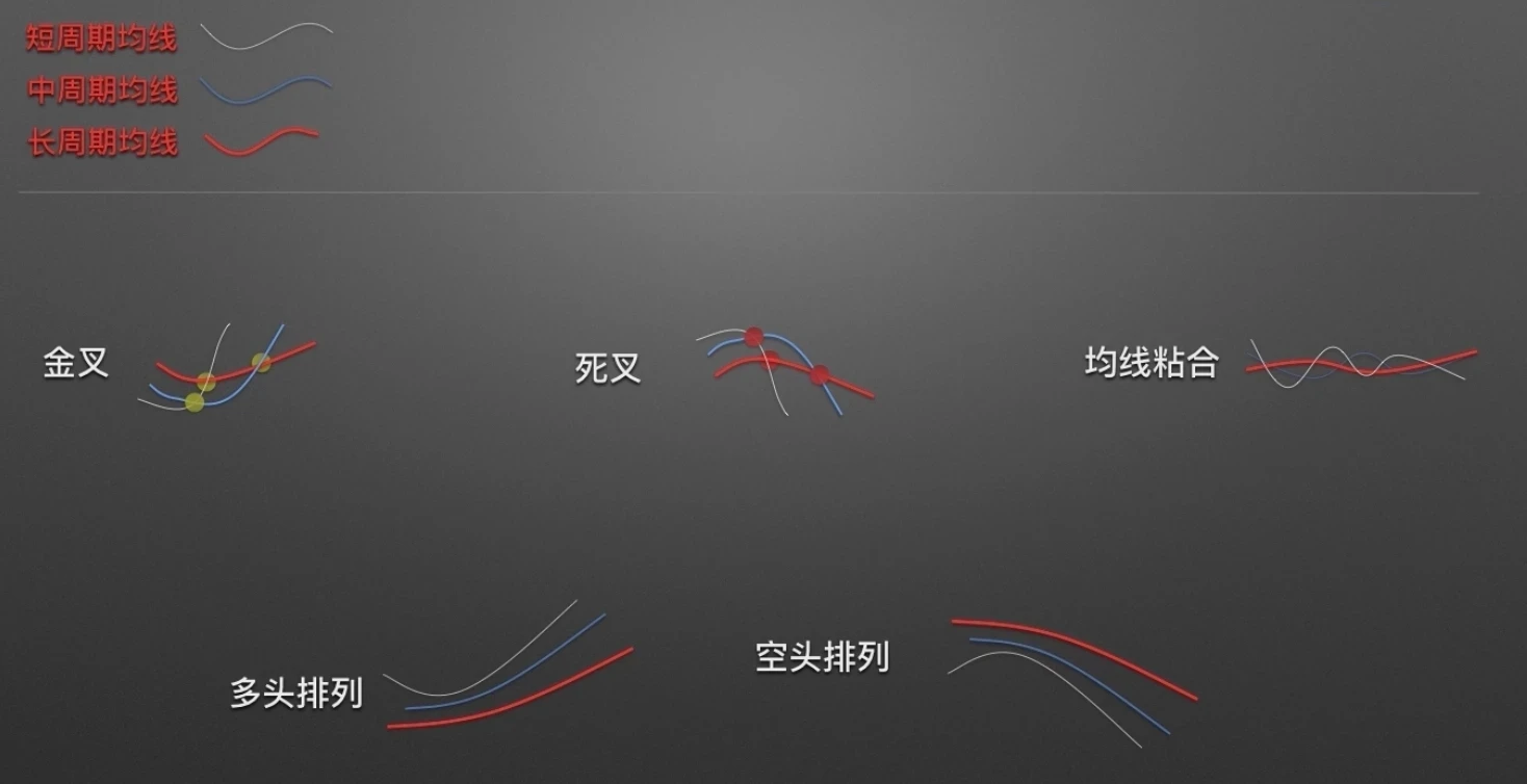 当相对短周期均线由下至上穿越相对长周期均线时所形成的交叉叫作金叉,前提条件:交叉的两条均线必须处于走平或者向上状态。当相对短周期均线由上至下穿越较长周期均线时所形成的交叉叫作死叉,前提条件,交叉的两条均线必须处于走平或者向下状态。