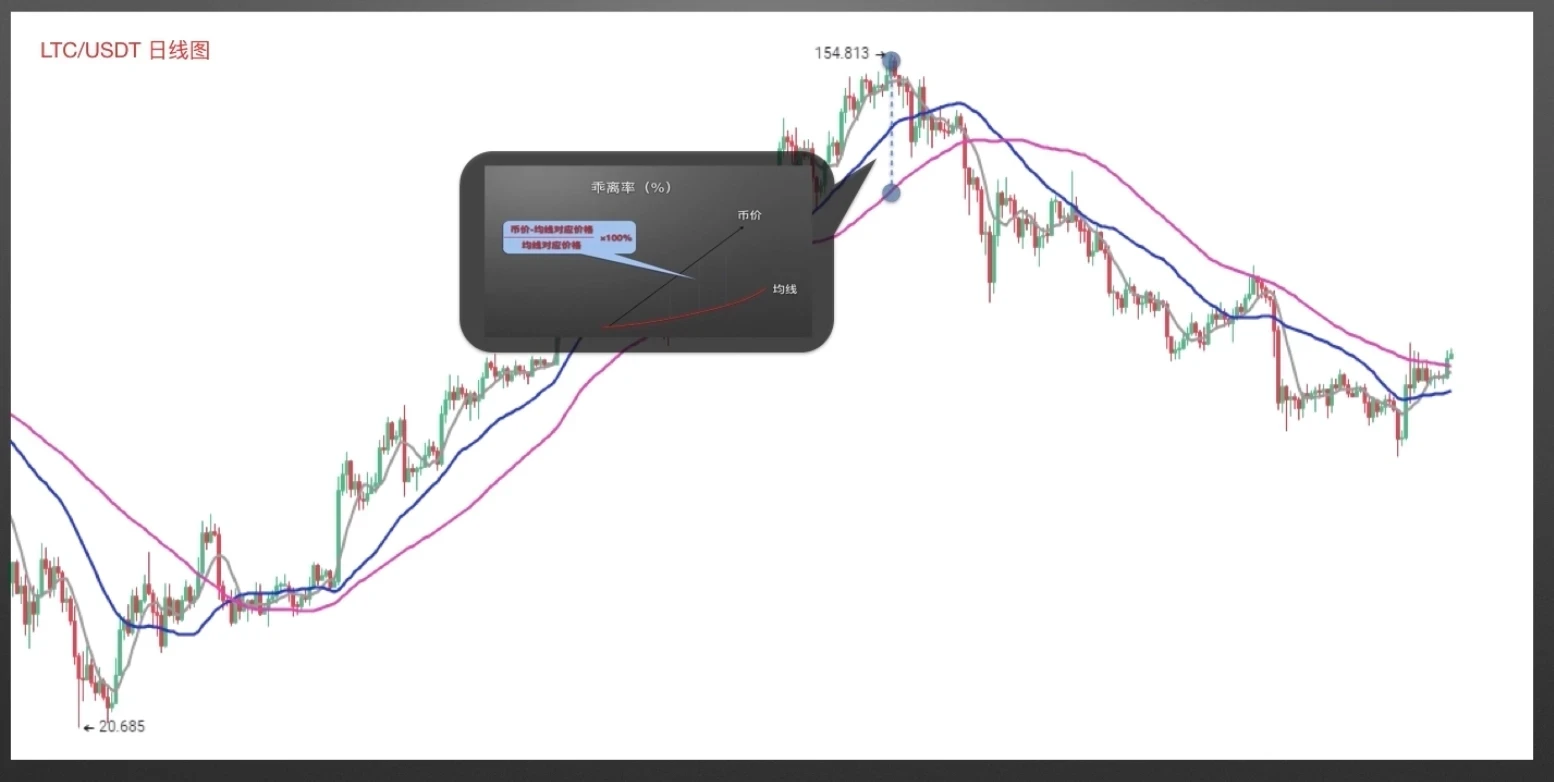 举例:加入当前BTC价格为10000美元,当时对应60日均线价格为7000元,则(10000-7000)÷7000×100%≈42.85%。