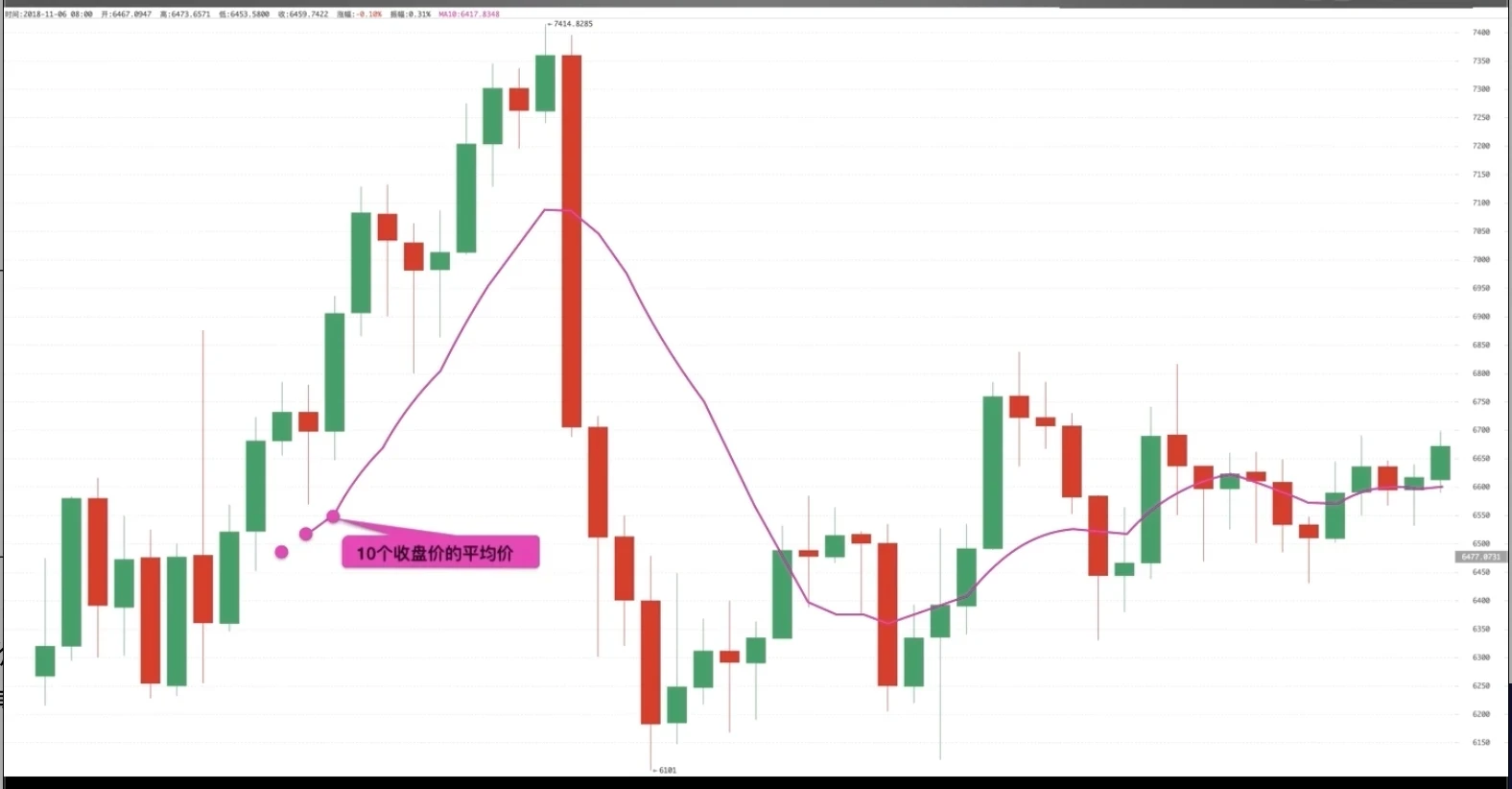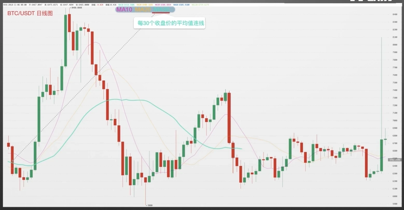 将一段时间价格,通常是收盘价格,相加后计算出平均值,再将每个平均值对应的点进行连线,所得出的曲线叫做移动平均线。由此可得出,一个币种的10日平均线形成过程是这样的,将相邻十根K线收盘价格相加后除以10,从第10根K线开始会得到很多点,也就是平均价格,最后将这些点连起来就是10个周期的移动平均线-MA10。