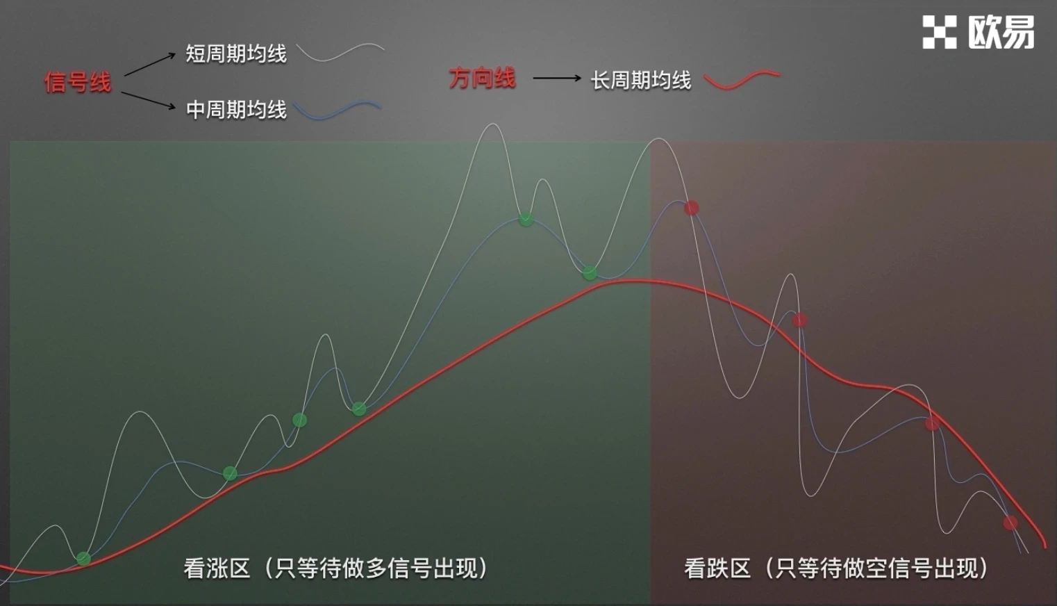 在看涨区,只要短期均线向上穿越中期均线就可做多,不必要是标准金叉,而死叉时的做空机会放弃。在看跌区,只要短期均线向下穿越中期均线就做空,不必要是标准死叉,而金叉时的做多机会放弃。