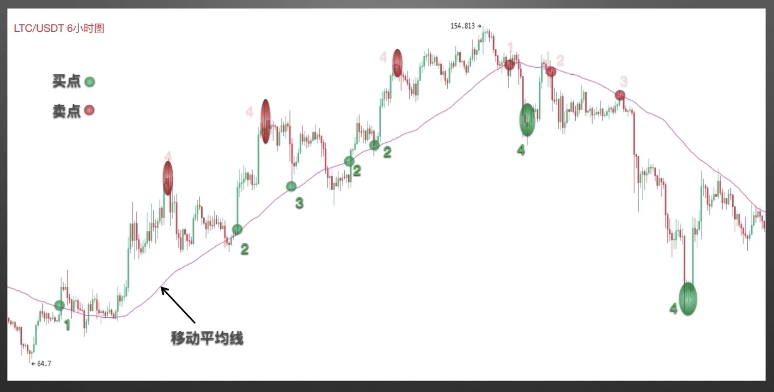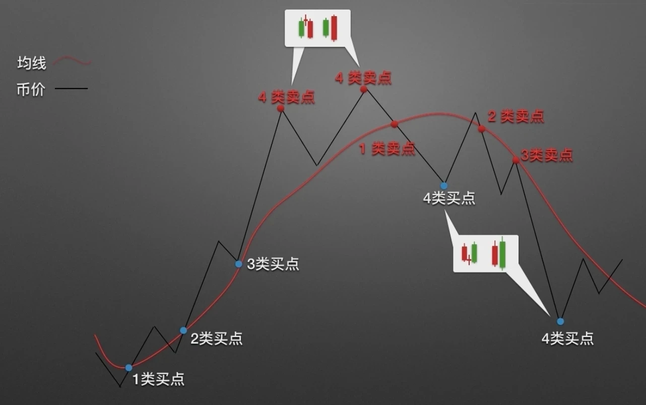 以上是4类买点,还有相对应的4类卖点。当价格在大涨后首次向下跌穿均线时形成第1类卖点。当价格在下跌过程中上破破均线,又重新下破均线时形成第2类卖点。当价格由均线下方向均线反抽,触及均线滞涨回落时形成第3类买点。当价格向上远离均线并出现看跌吞没、黄昏之星等看跌K线组合时,第4类卖点形成。