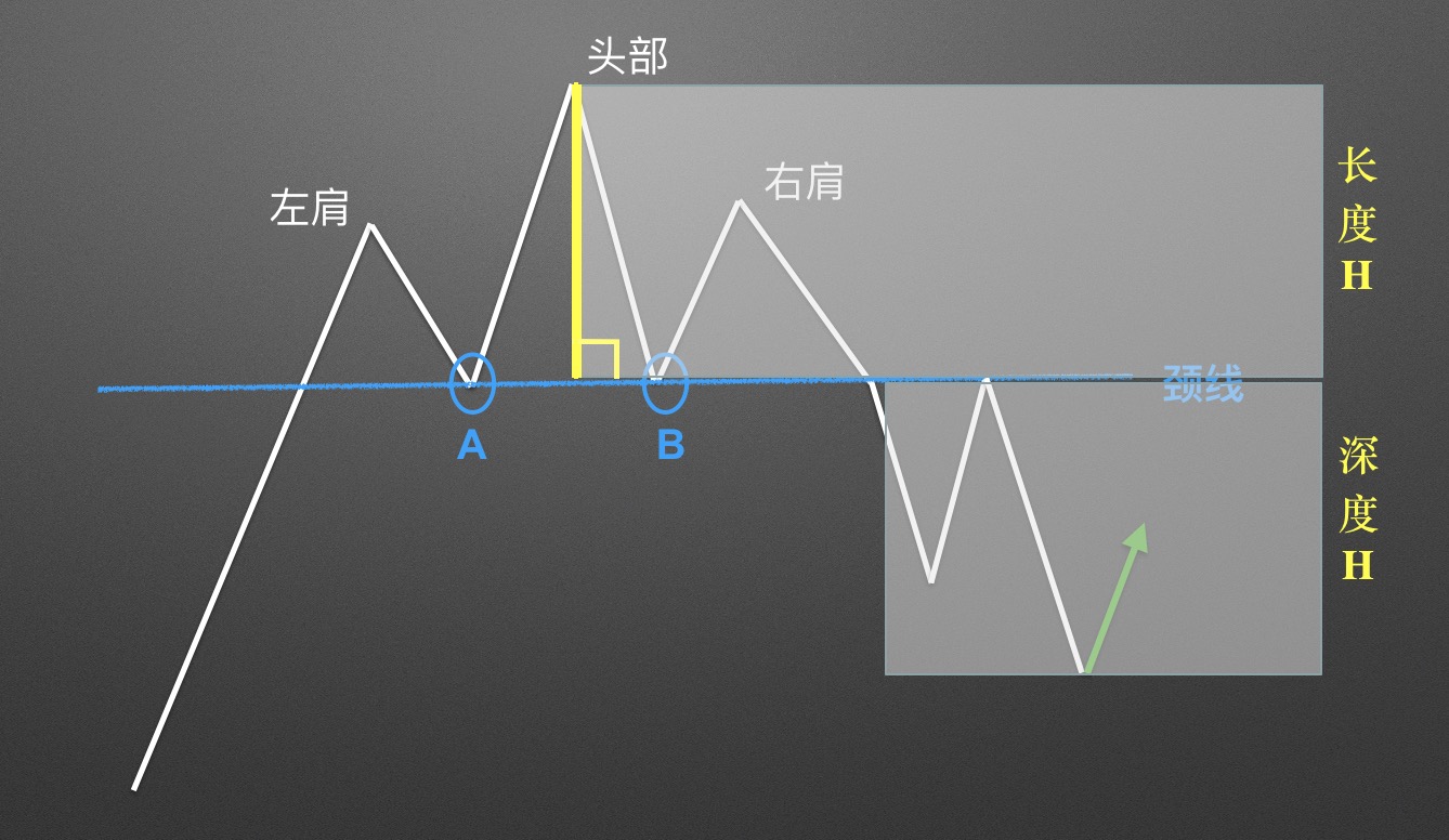 将这根垂线段如图移动至颈线之下,未来价格大概率会下跌至深度H,当然,如果下跌趋势强劲,下跌会延续更久、更深。超出的部分,是不在可预测范围的。