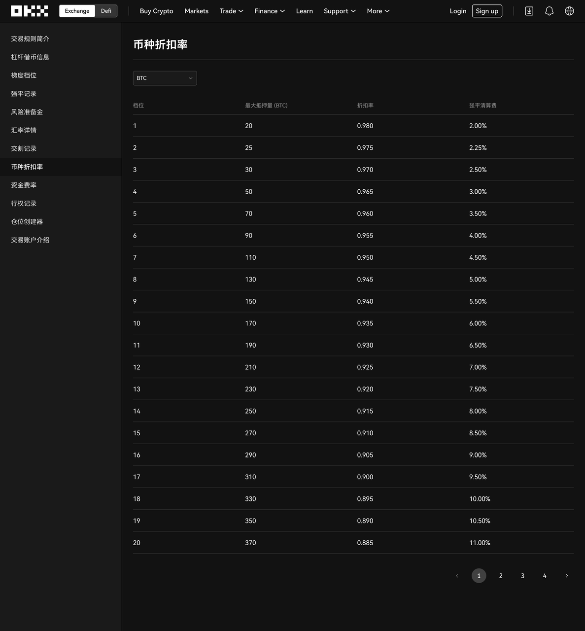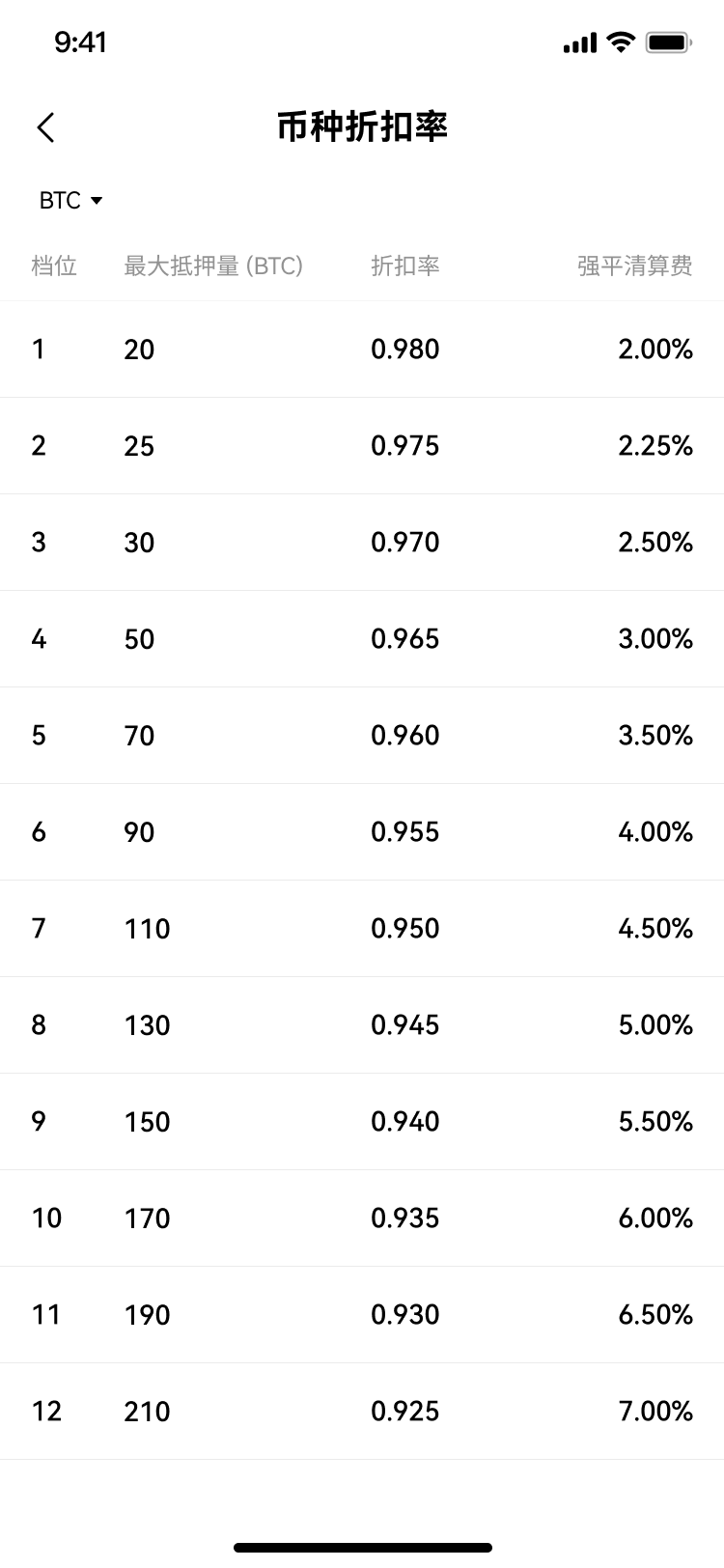 更改后的币种折扣率档位根据币种数量分档,且每个币种有独立的档位,每档折扣率随着币种数量的增加而递减,展示如下 (以 BTC 为例)。