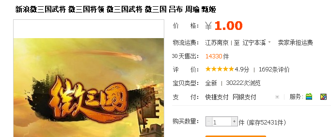 大量小号进行刷将,出售给游戏玩家,里面的武将100多一个到几十元一个不等。淘宝销量无压力。
