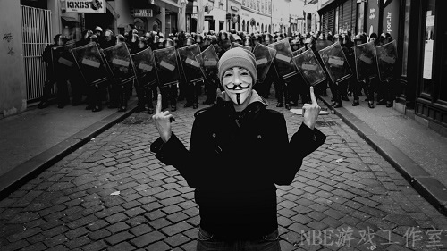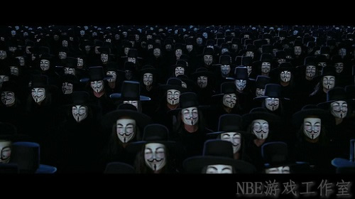 配图:V字仇杀队。V字做出了一种让人们信服的姿态,给了人们以信心,所以,人民们才在那天晚上集体戴上面具走上街头,推翻了一个压制的ZF。