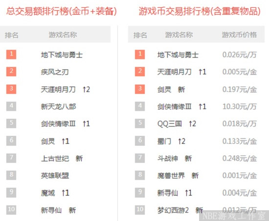 其他网络游戏:剑网3一直坚挺这个不奇怪,与梦幻西游一样,点卡网游就是寿命长,交易量大。比较奇葩的是新天龙八部冲进了金币+装备排行榜,比较让人意想不到,搜狐的封号手段也是牛逼的,居然了,还有游戏工作室能在里面捞金,看来真是人外有人,天外有天啊。地下城与勇士这款游戏就不用评论了,无论封号怎么厉害,依然是大型游戏工作室的主攻项目。