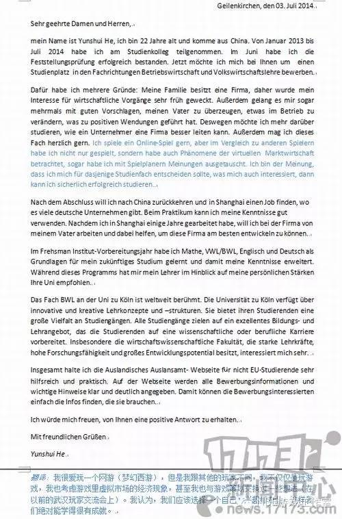 申请德国大学,你需要写一份动机信,告诉德国导师你的申请理由。我觉得外国人心态会比较开放,所以我如实写上“我很爱玩一个网游(梦幻西游),但是我跟其他的玩家不同,我不仅仅是玩游戏,我也考虑游戏里虚拟市场的经济现象。我认为,我们应该选择一个自己感兴趣的专业,这样我们绝对能学得很有成就。”