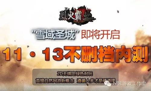 《烈火霸业》将于11月13日不删档内测(无需激活码),广告宣传语:边玩游戏边赚钱,打怪爆装备!是由广州尚聚网络科技有限公司研发运营的一款2D三国风格的MMRPG国战游戏。游戏2D画面,主打PK,并且“可爆装备”,与其说是传奇类PK网游,到不如说是传奇+征途!嘿嘿,小编是这样理解的!