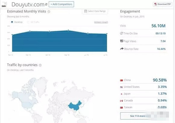 知乎上的Matrix 小泽直树截取了斗鱼和twitch的月流量图做对比。可以看出,twitch的流量是斗鱼的7倍左右。