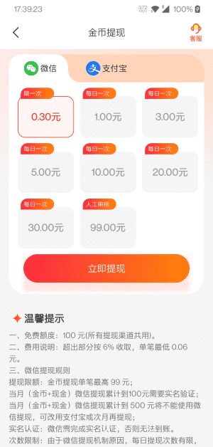 ⑦金币首次满0.3元可提,后续1元起提,支持微信和支付宝,团长提现10元起,团长提现还增加了银行卡选项