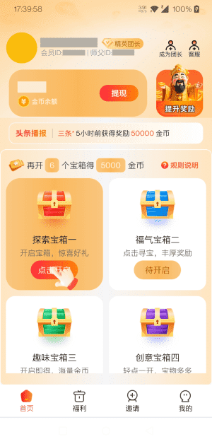 ④开前5个宝箱有几率触发财神赐福可提升金币数,建议开第6个宝箱前先点提升收益到满包时或提升很少时再开