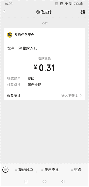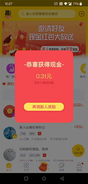 新上线,多趣赚App下载打开,使用微信登陆后,即送0.31元自动秒到微信账户;平台里面还有“每日任务”奖励和“分红”奖励
