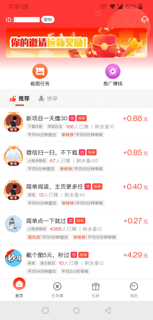 ③支持邀请有提成:平台提供了丰厚的邀请奖励,叠加可获得累计14%的多级提成,邀请好友完成的任务越多,收益分成奖励越多