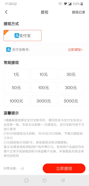 ④提现稳定低门槛:提现门槛低至1元,支持支付宝提现,每次提现支持1-5000元的多面额选项,18点前提交提现,可在当天到账