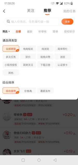 ①免费下载轻松赚:平台任务实时更新,有推荐和快审专区,点击底部“任务赚”可在右上角进行筛选任务类型,也支持搜索任务