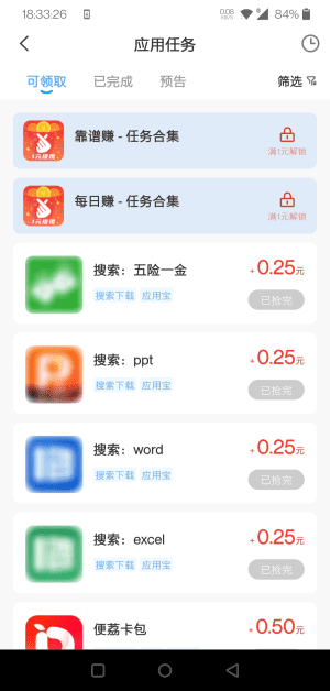 - 任务类型多样,包括搜索体验、公众号关注、小程序试用等,单价0.3元至数元不等。