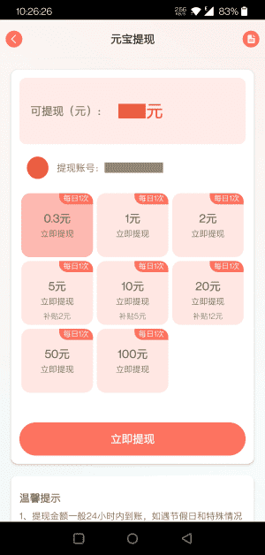 ⑤提现快速:满0.3元微信提现,1元起需审核,单次限100元,通常24小时内到账,手动领