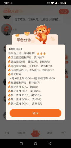 橙风破浪App(乘风破浪)新上线,由西安灵镜光年科技有限公司推出的看广告和短剧的赚钱平台,类似同旗下上一个推出的顺鑫生活App。橙启新章,解锁薪方式!