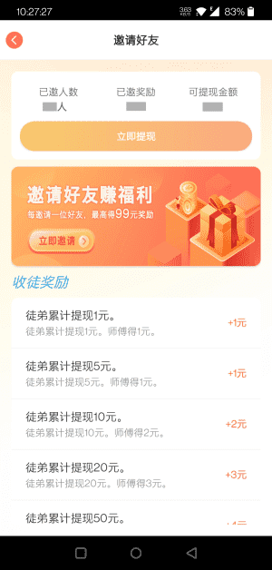 邀请好友最高可得99元,分为V1团长(提现1元),V2团长(直邀20人)和V3团长(直邀50人)。