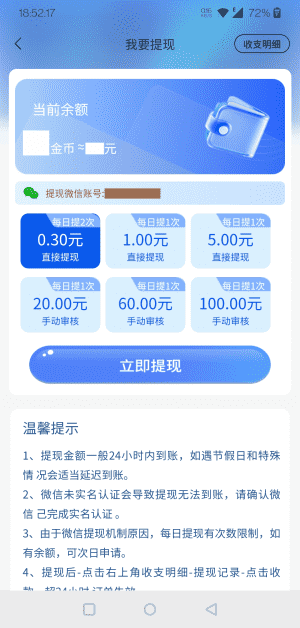 ③每天都放水,多包好打收益更快,最低满0.3元就能微信提现,24小时内到账