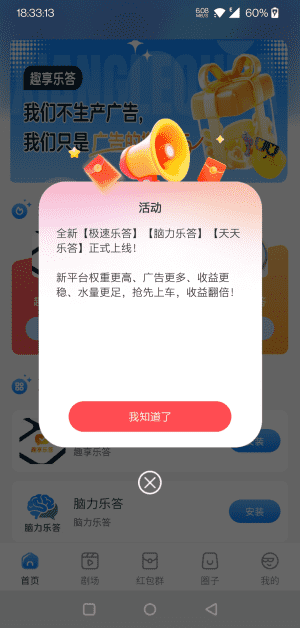 首包趣享乐答平台自3月25日上线以来,便受到了用户们的热烈追捧,平台方应广大用户的需求,紧急新增了多个分包,并且这一进程仍在持续不断推进中,后面仍会陆续上新分包。该平台类似洋洋家的平台,看广告红包群模式玩法,收益高,水量大,可联系对接本站开高团,查看《团长招募》,开团请提供用户ID(非邀请码)。