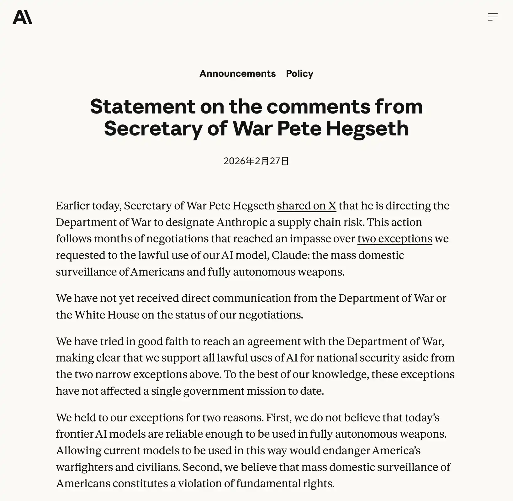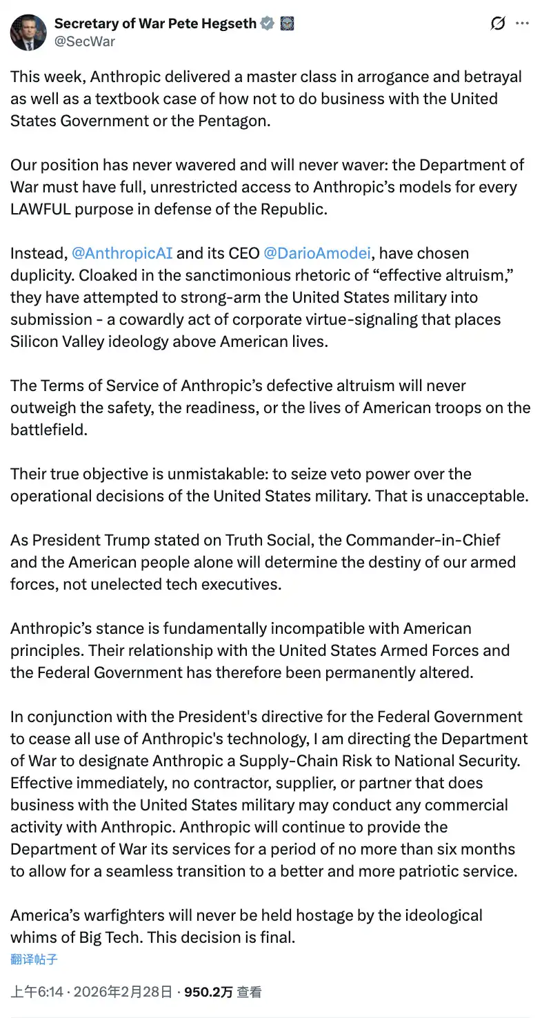 Anthropic 的最後通牒時間已到。Dario 沒有妥協。Trump 在 Truth Social 上宣布封禁,Hegseth 在 X 上發文將 Anthropic 列為「供應鏈風險」,Anthropic 宣布將通過法律途徑應對。