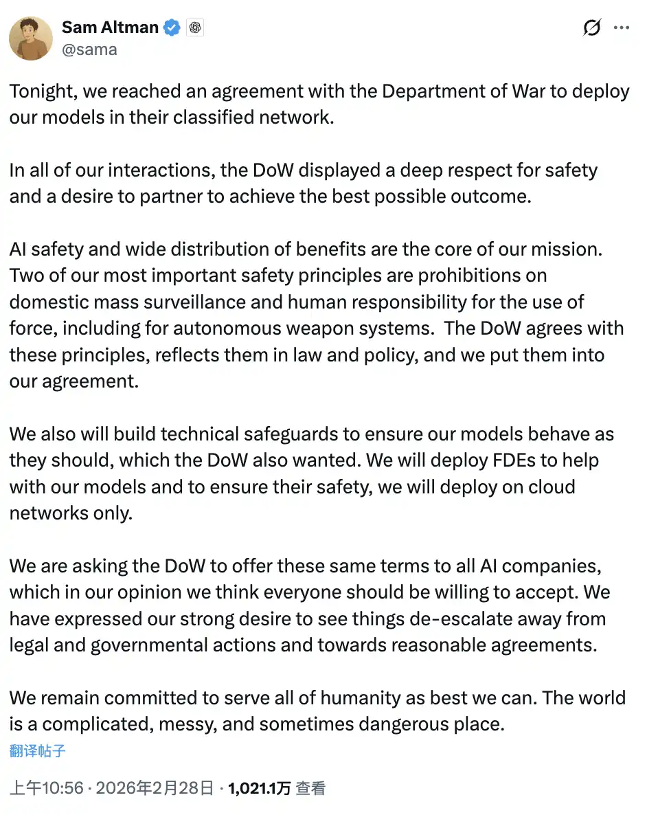 北京時間 2 月 28 日上午,Sam Altman 發了一條推文:「今晚,我們與美國陸軍部達成協議,將我們的模型部署到他們的機密網絡中。」
