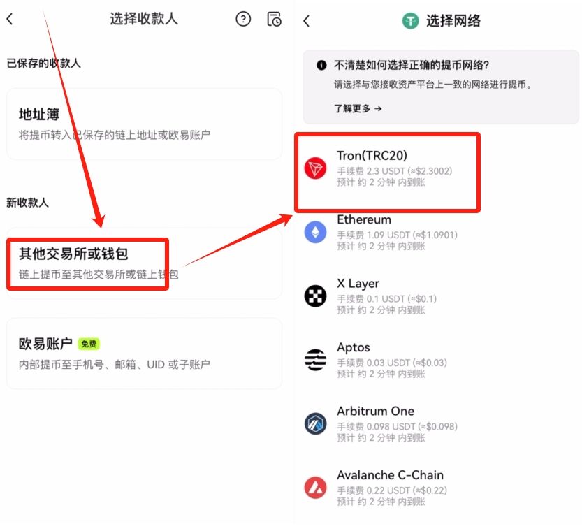 当然如果你想把币提到其他交易所或钱包,就可以点击“其他交易所或钱包”,然后选择一个网络,比如说我这里选择TRC20网络。