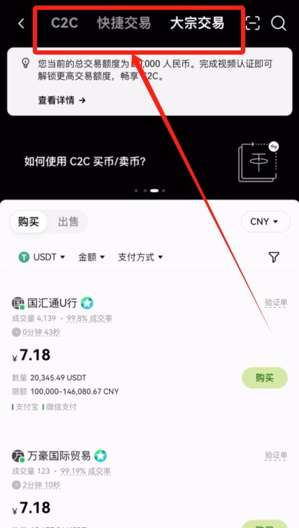 这里可以看到有快捷交易、C2C还有大宗交易。