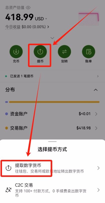 我们来到下方的【资产】,选择【提币】,选择“提取数字货币”。