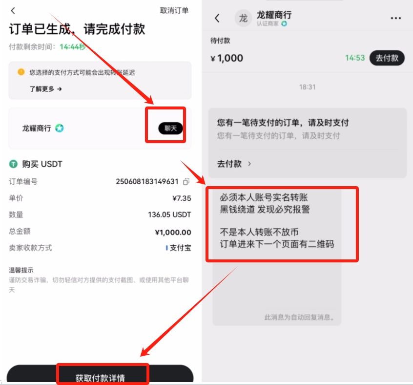 这时候这个订单就生成了,我们可以在聊天这里看看卖家有哪些要求,比如说实名转账。点击【获取付款详情】。