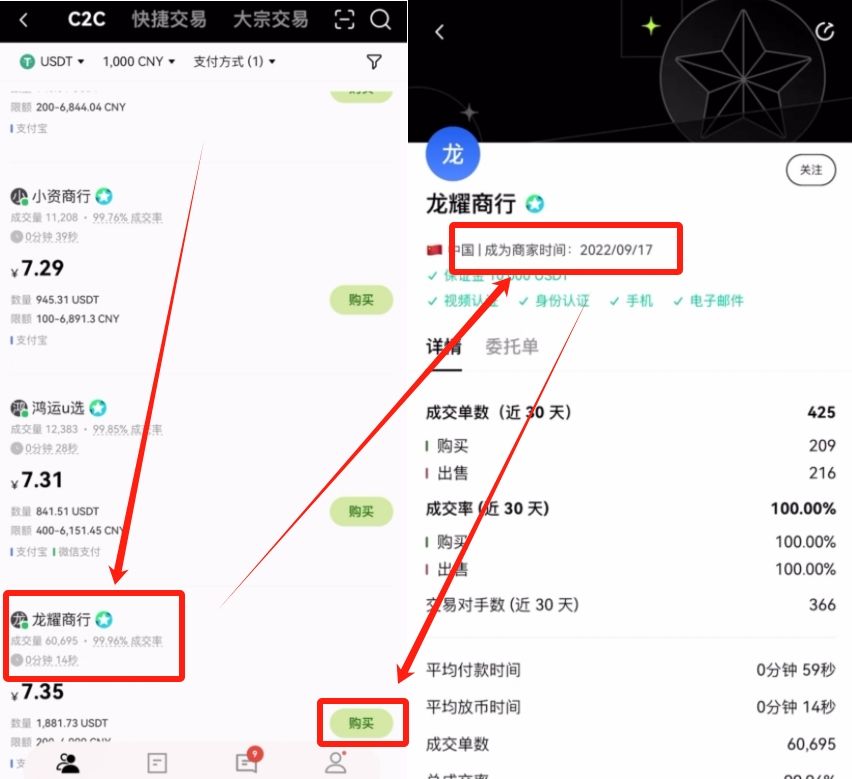 在下方的商家这里挑选一个去跟他交易。我们点开一个成交量和成交率都比较高的商家的主页,看到他成为商家的时间是22年9月份,距离现在已经将近三年了。我们就要找这种注册时间比较久的商家去跟他交易,因为他的账户存活的时间越久,就证明他的资产越安全。我们就可以点击【购买】。