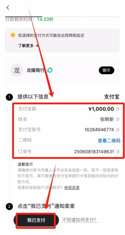 然后离开平台,根据这些信息,按照商家的要求去给他转账就可以了。转账完成之后再点击这里的【我已支付】,通知一下卖家。等待卖家给我们放币就可以了。