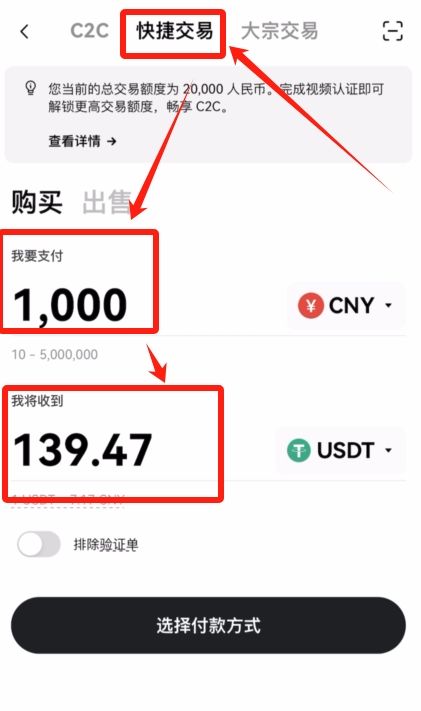 如果我们是小额的入金,就选择“快捷交易”。我们可以直接在这里面输入想要购买的金额,比如说1000人民币,这样它就给我们换算出来你大概可以收到139.47个USDT。