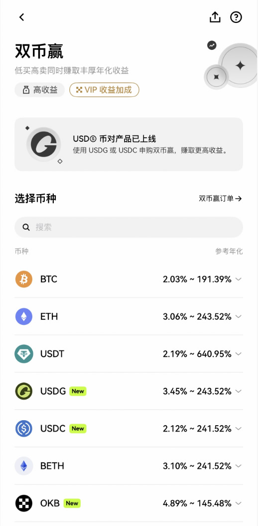 打开欧易APP(官方注册 官方下载),在【赚币与奖励】里选择【双币赢】。