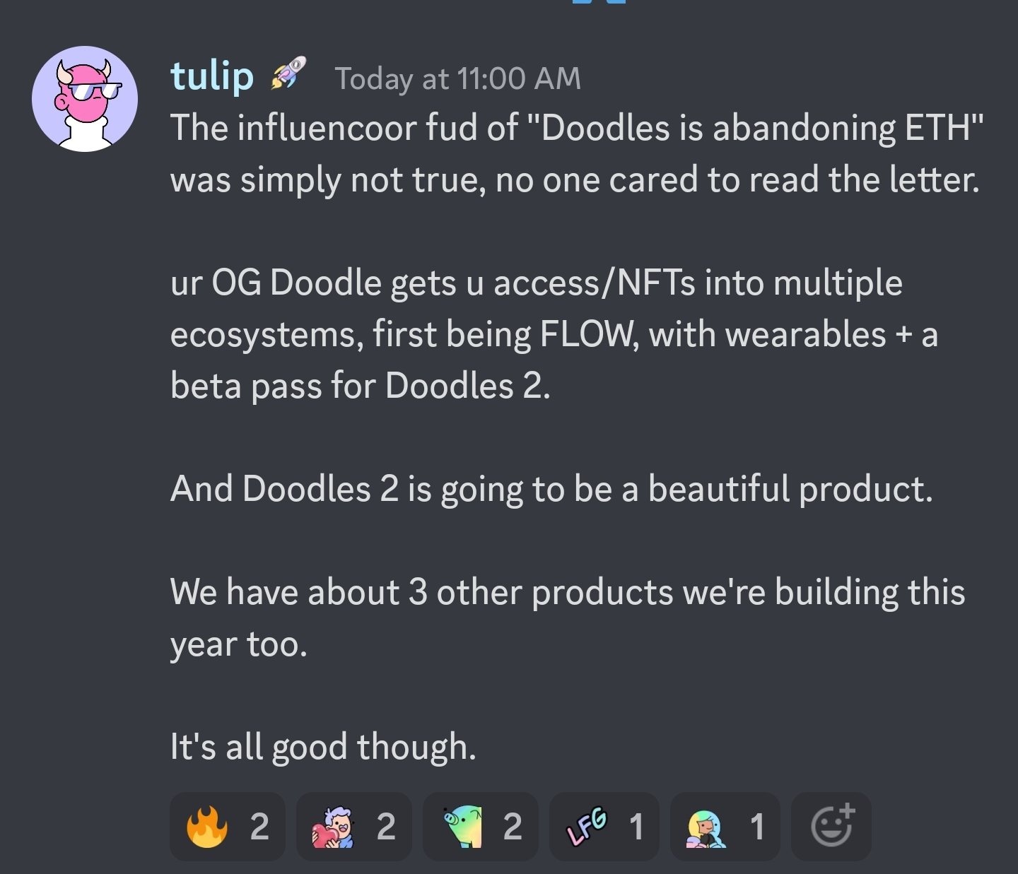 萌币网 消息,Doodles 联合创始人 Evan Keast(Tulip)在官方 Discord 社群表示,「Doodles 放弃 ETH 的说法是完全错误的」,Doodles 的 OG 用户能够通过可穿戴设备访问多个生态系统(Flow 网络是第一个),并将获得 Doodles 2 的 beta pass。而 Doodles 2 将会是一个漂亮的产品,今年「我们还有大约 3 个其他产品将推出」。