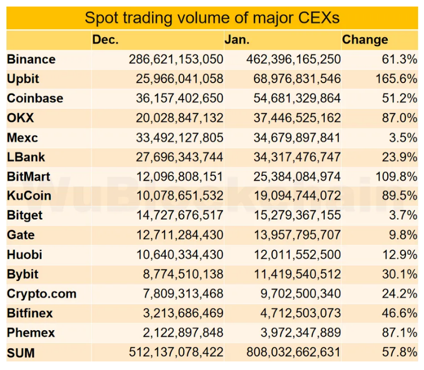 萌币网 消息,据吴说区块链统计,1 月份主要交易所的现货交易量环比上涨 57.8%,涨幅最大的三个分别是 Upbit(166%)、BitMart(110%)和 KuCoin(90%);1 月份主要交易所的衍生品交易量环比增长 47.6%,涨幅最大的三个分别是 Phemex(190%)、Bybit(98%)和 Gate(85%);1 月份主要交易所网站的访问量环比增长 4.5%,涨幅最大的三个是 Upbit(35%)、Deribit(22%)和 Coinbase(13%)。