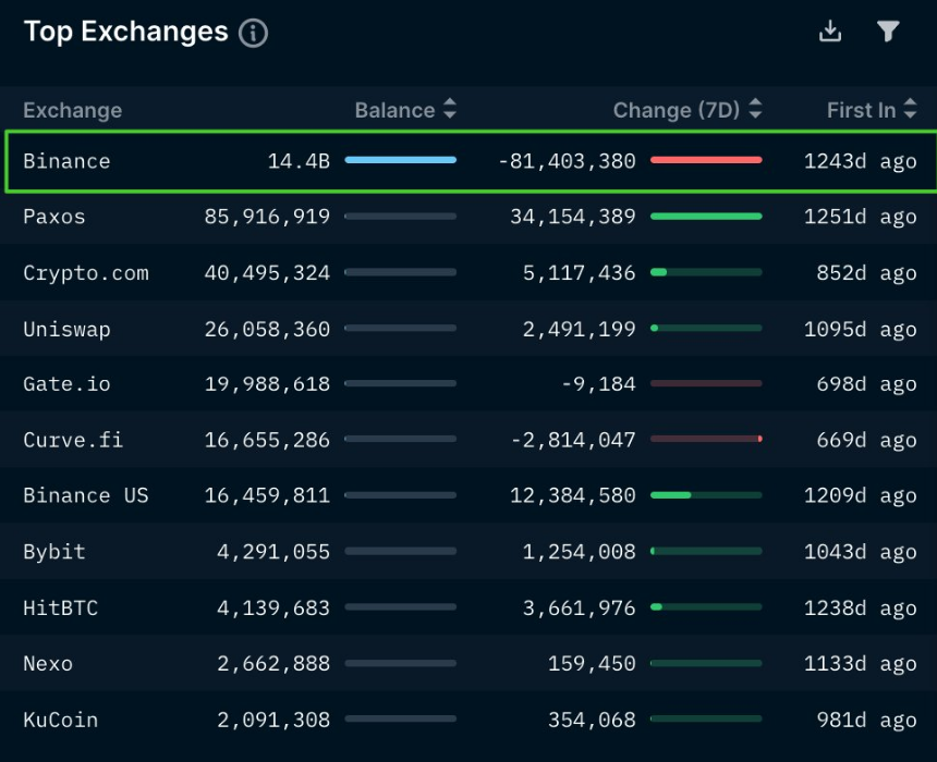 萌币网 消息,Nansen 数据显示,目前 BUSD 总市值 160 亿美元,排名稳定币第三,大约 90%(144 亿美元)的 BUSD 处于币安地址。其中过去 7 天内币安净流出超 8140 万枚 BUSD,此外 Jump Trading 某地址在过去 7 天内从交易所净提取了 5780 万枚 BUSD,该地址仍持有 1880 万枚 BUSD。