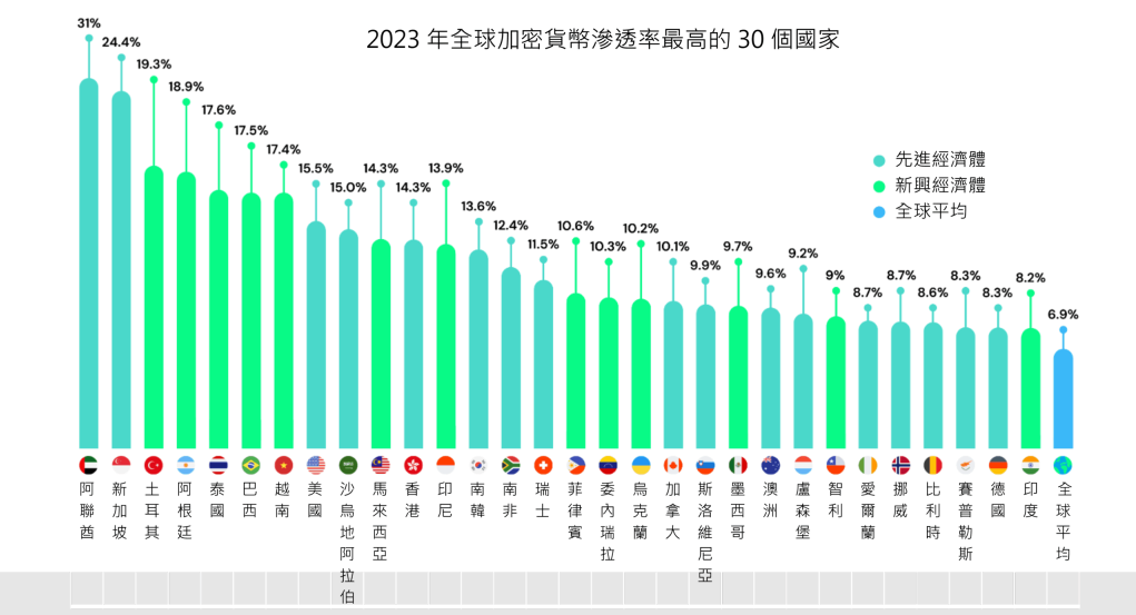- 新加坡(24.4%)为先进经济体中表现最亮眼者,显示其对金融创新与加密友善的监管环境正发挥效应。