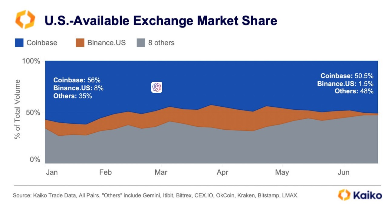 萌币网 消息,Kaiko 数据显示,Binance.US 占美国加密货币交易所每周总交易量的 1.5%,低于年初的 8.2% 和 3 月底的 22% 峰值,Coinbase 的市场份额也从 2023 年初的 56.5% 降至 6 月底的 51%,而 LMAX、Bitstamp 和 Kraken 在内的交易所的市场份额则有所上升。