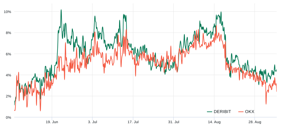 如上图所示,期权 25% 的 Delta 偏差最近已进入看跌区域,与类似的看涨(买入)期权相比,保护性看跌(卖出)期权在 9 月 4 日的交易价格溢价 9%。