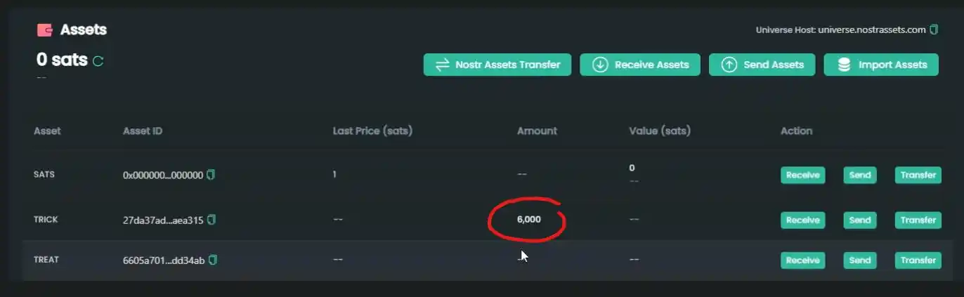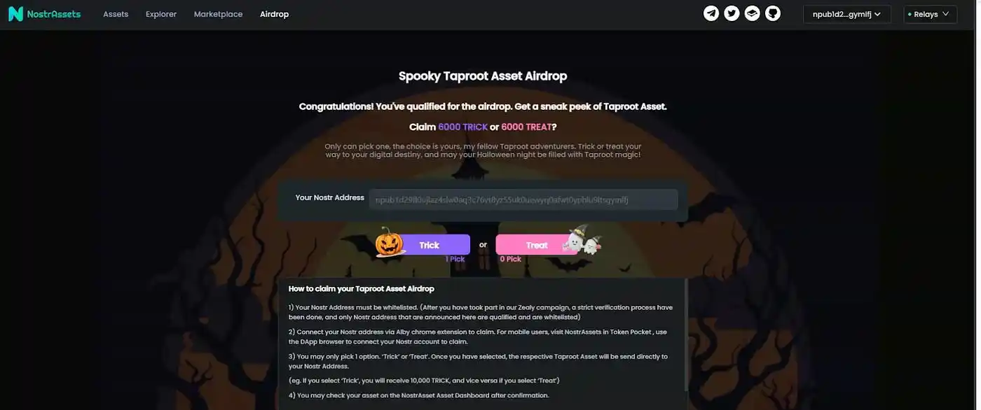 TRICK or TREAT 资产由 NostrAssets 创建,旨在让全球更多的人能够访问 Taproot Assets。作为 Taproot Assets 的先驱,NostrAssets 允许用户在我们的平台上发送、接收、转账和交易 Taproot Assets。