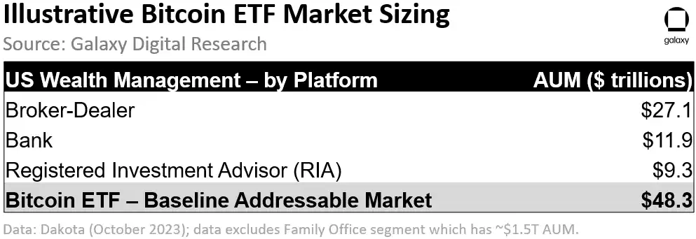 鉴于上述提到的可获得性原因,美国财富管理行业可能是最具潜力和最直接受益于获得批准的比特币 ETF 的市场。截至 2023 年 10 月,由经纪商(27 万亿美元)、银行(11 万亿美元)和受托人顾问(9 万亿美元)共计管理的资产总额达到了 48.3 万亿美元。