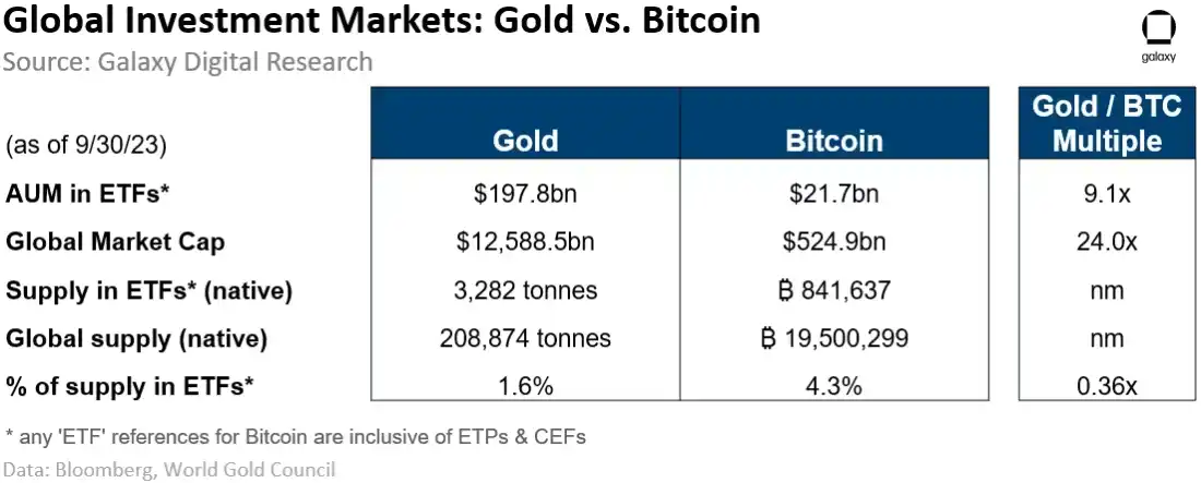 考虑到黄金市值大约是比特币的 24 倍,而持有投资工具的供应量比比特币少了 36%,我们可以假设相同数量的资金流入对比特币市场的影响大约是黄金市场的 8.8 倍。