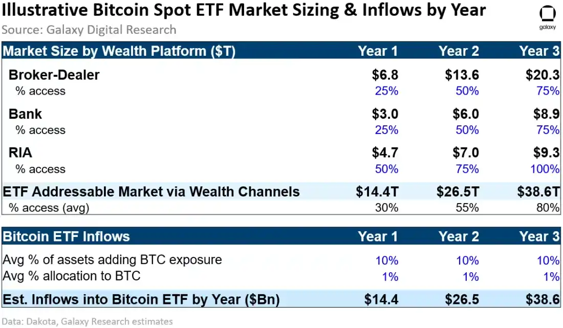 我们假设 RIA 渠道将从第一年开始以 50% 的准入份额逐渐增加到第三年达到 100%。对于经纪商和银行渠道,我们假设在第一年以 25% 的准入份额开始,逐渐增加到第三年的 75%。根据这些假设,我们估计美国比特币 ETF 的可获得市场规模在启动后第一年约为 14 万亿美元,第二年约为 26 万亿美元,第三年约为 39 万亿美元。