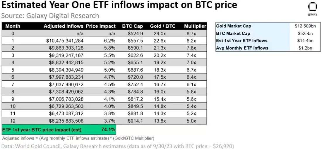 如果保持资金流入不变,但根据比特币价格上涨导致的金市值/BTC 市值比率变化,每月逐渐调整乘数向下调整,我们可以看到月度回报从第一个月的正 6.2% 逐渐下降,到第一年最后一个月的正 3.7%,导致比特币在 ETF 批准的第一年内估计上涨 74%(以 2023 年 9 月 30 日比特币价格 26,920 美元为起点)。